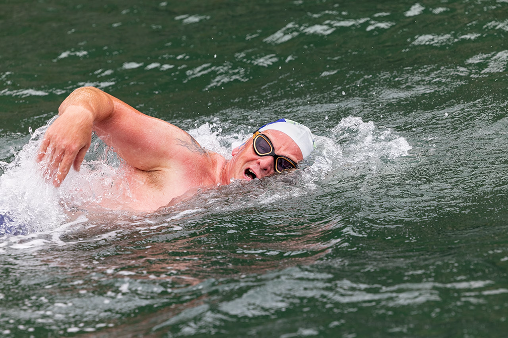 ledeno mrzli vodi. Preplaval je 19 uradno priznanih ledenih milj (Ice Mile), to pomeni, da je preplaval
